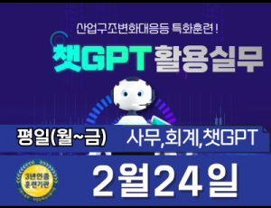 | 과정명 | 챗GPT활용한 업무자동화 양성       09:00~14:50 (월~금) [진행중] |